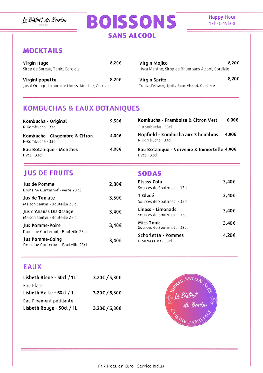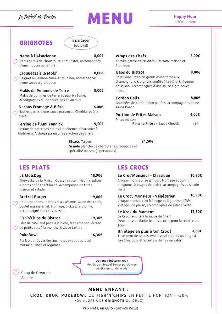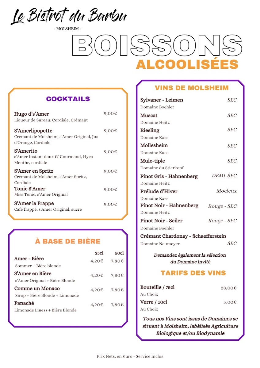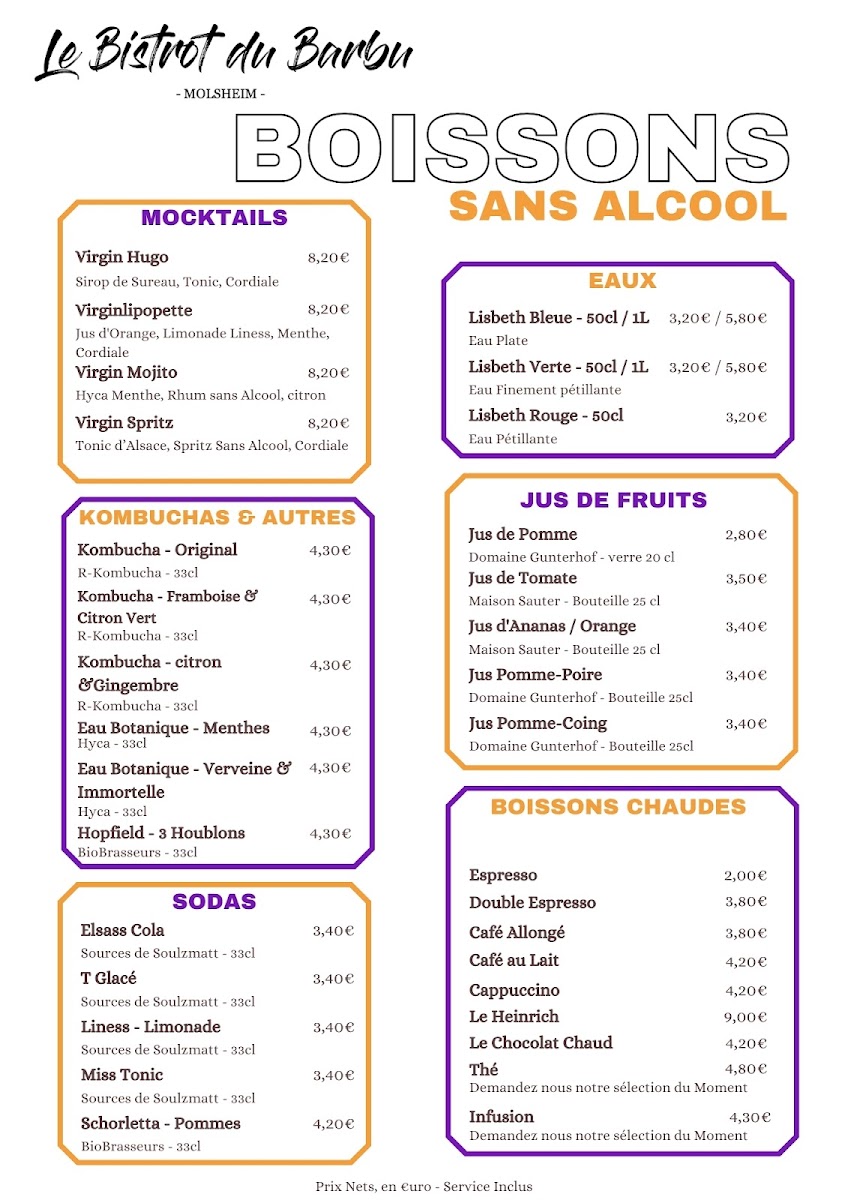 For a local touch, try the Bière Sans Alcool Locale, a refreshing alcohol-free beer that pairs wonderfully with any of the dishes on the menu. If you're a fan of hot dogs, the Le Mols'dog Le Hot Dog de Molsheim offers a unique twist on the classic, while the Alsace Tapas delivers a selection of small dishes that showcase the region's culinary diversity.